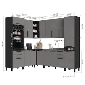 Fabricada em MDP de alta qualidade, conta com prateleiras removíveis, dobradiças metálicas com slow motion, corrediças telescópicas, pés com regulagem de altura (+3cm) e tampo incluso apenas nos balcões de canto e de 80cm.