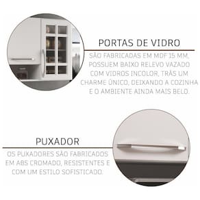 Os módulos são avulsos (cada peça é independente uma da outra) possibilitando assim vários arranjos, o espaço interno, que vem com prateleiras e divisórias, é ótimo para organização dos utensílios e mantimentos. Fabricados em material resistente, como chapas de MDP 15mm, corrediças telescópicas e dobradiças metálicas. Com puxadores cromados em ABS, pés em plástico com regulagem de altura.