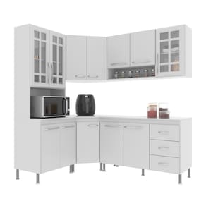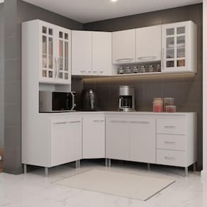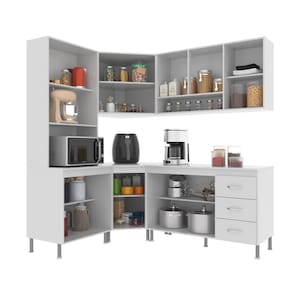 Os módulos são avulsos (cada peça é independente uma da outra) possibilitando assim vários arranjos, o espaço interno, que vem com prateleiras e divisórias, é ótimo para organização dos utensílios e mantimentos. Fabricados em material resistente, como chapas de MDP 15mm, corrediças telescópicas e dobradiças metálicas. Com puxadores cromados em ABS, pés em plástico com regulagem de altura.