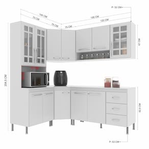 As medidas totais são: 340cm de largura x 204,5cm de altura. A profundidade é de cozinha planejada: 53 cm nos balcões x 32cm nos aéreos.