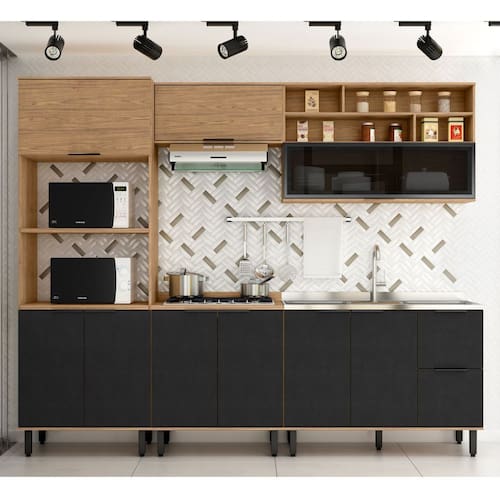 Como trata-se de uma cozinha modulada (Módulos Independentes), ela pode ser montada com um Layout diferente, dependendo do seu ambiente. Assim, se torna praticamente uma cozinha planejada para sua casa.