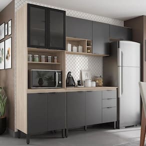 A Cozinha Modulada Firenze Composição 6 é formada por um paneleiro 4 portas com 2 portas de vidro fumê, um aéreo 2 portas 120cm sendo uma com pistão a gás com abertura para cima também com nicho e porta vinhos, um aéreo de geladeira 70cm porta basculante com pistão a gás, um balcão 120cm com 3 portas e 2 gavetas com tampo MDP que pode ser substituído por pia. Seus pés são de polipropileno reguláveis se adequando as condições do chão, puxadores pretos com design moderno, corrediças telescópicas e dobradiças metálicas. Estruturado em MDP com revestimento ultravioleta e acabamento fosco.