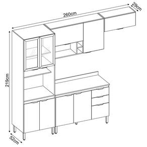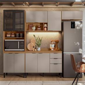 A Cozinha Modulada Firenze Composição 6 é formada por um paneleiro 4 portas com 2 portas de vidro fumê, um aéreo 2 portas 120cm sendo uma com pistão a gás com abertura para cima também com nicho e porta vinhos, um aéreo de geladeira 70cm porta basculante com pistão a gás, um balcão 120cm com 3 portas e 2 gavetas com tampo MDP que pode ser substituído por pia. Seus pés são de polipropileno reguláveis se adequando as condições do chão, puxadores pretos com design moderno, corrediças telescópicas e dobradiças metálicas. Estruturado em MDP com revestimento ultravioleta e acabamento fosco.
