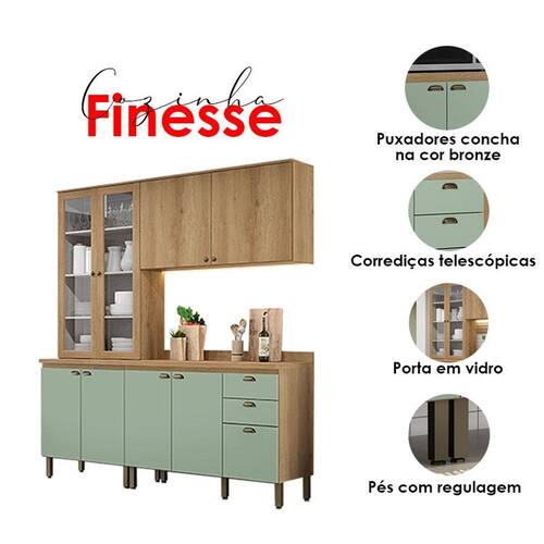 A cozinha modulada Finesse da THB Móveis é um conjunto de módulos de cozinha que permitem montar um ambiente completo e funcional com peças combináveis conforme seu espaço. Os módulos vêm em acabamento Capuccino com Menta, traçando um visual moderno, elegante e contemporâneo que combina com diversos estilos de decoração.