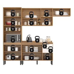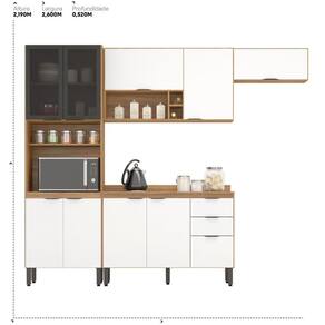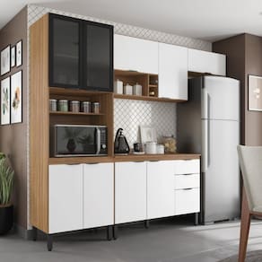 A Cozinha Modular FIRENZE é composta por um paneleiro com 4 portas (2 de vidro fumê e espaço para forno até 44L), aéreo de geladeira 70cm com porta basculante, aéreo 120cm com prateleiras e nicho, e balcão 120cm com 3 portas, 2 gavetas e tampo que pode ser substituído por pia.