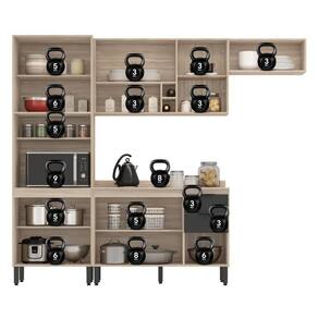 A Cozinha Modular FIRENZE é composta por um paneleiro com 4 portas (2 de vidro fumê e espaço para forno até 44L), aéreo de geladeira 70cm com porta basculante, aéreo 120cm com prateleiras e nicho, e balcão 120cm com 3 portas, 2 gavetas e tampo que pode ser substituído por pia.