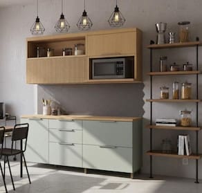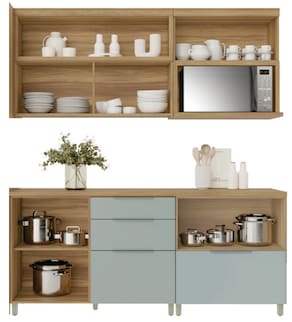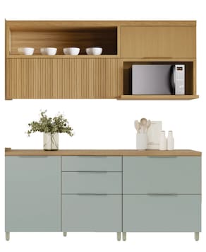 O conjunto é composto por quatro módulos estratégicos: um balcão de 120cm com 3 gavetas (incluindo um gavetão com laterais altas) e um balcão de 80cm, ambos com tampo resistente. Na parte superior, o armário aéreo de 120cm oferece amplo espaço, enquanto o aéreo de 80cm conta com nicho exclusivo para micro-ondas e porta basculante com pistão a gás.