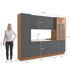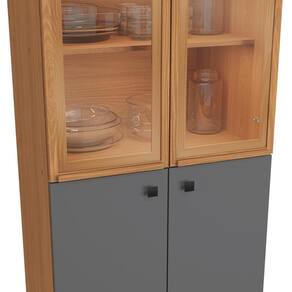 Com seis peças, incluindo cristaleira, paneleiro, balcão de pia, gaveteiro e aéreos, ele se adapta a todos os espaços e você terá amplo espaço para organizar louças, mantimentos e demais itens. Com 2,20m de altura e 2,80m de largura, ele conta com uma combinação de cores linda. O corpo traz o aconchego da cor canela, em pintura touch com a textura dos veios da madeira, enquanto as frentes, em acabamento BP fosco, contam com a sofisticação do cinza sagrado e maior resistência contra riscos, arranhões e gotas d'água.