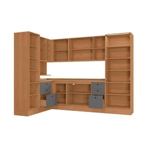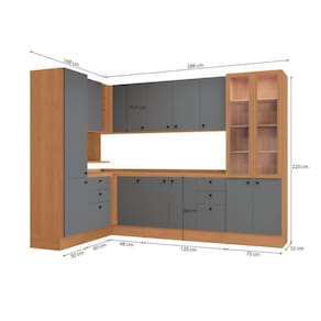 São nove peças, incluindo cristaleira, paneleiro, balcão e aéreo de canto, nicho microondas, gaveteiro, balcões e aéreos, ele se adapta a espaços amplos, garantindo estilo e muito espaço para organizar louças, mantimentos e demais itens. Com 2,20m de altura, ele conta com uma combinação de cores linda. O corpo traz o aconchego da cor canela, em pintura touch com a textura dos veios da madeira, enquanto as frentes, em acabamento BP fosco, contam com a sofisticação do cinza sagrado e maior resistência contra riscos, arranhões e gotas d'água.
