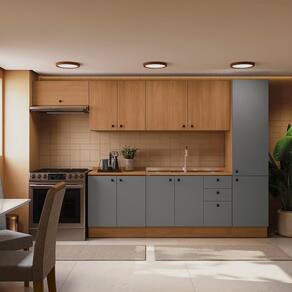 Com seis peças, incluindo paneleiro, balcões e aéreos, ele se adapta a espaços amplos, garantindo estilo e muito espaço para organizar louças, mantimentos e demais itens. Com 2,20m de altura e 3,30m de largura, ele conta com uma combinação de cores linda. O corpo e os aéreos trazem o aconchego da cor canela, em pintura touch com a textura dos veios da madeira, enquanto as frentes, em acabamento BP fosco, contam com a sofisticação do cinza sagrado e maior resistência contra riscos, arranhões e gotas d'água. Detalhes pensados para garantir um ambiente lindo, moderno e aconchegante para curtir cada momento, incluindo mais facilidade durante a limpeza.