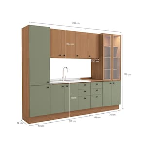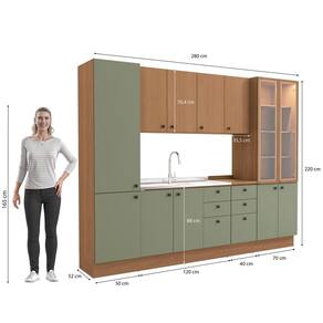 O corpo e os aéreos contam com o aconchego da cor canela, em pintura touch com a textura dos veios da madeira, enquanto as frentes, em acabamento BP fosco, contam com a modernidade do verde frevo e maior resistência contra riscos, arranhões e gotas d'água. Detalhes pensados para garantir um ambiente lindo e aconchegante, e remetendo aos tons da natureza, você poderá curtir cada momento, além de ter mais facilidade durante a limpeza. Os diferenciais ficam para as portas com amortecimento, garantindo um fechamento suave, sem ruídos e mais durabilidade. As gavetas, com corrediças telescópicas, permitem a abertura total e um melhor aproveitamento de espaço.