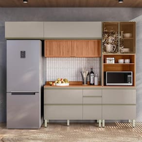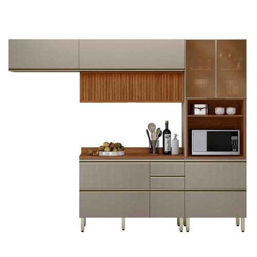 A Cozinha Modulada Proença 4 Peças com Aéreo 120cm Ripado une sofisticação, funcionalidade e resistência em cada detalhe. Produzida em MDF com pintura UV, conta com portas, sendo duas com vidro reflecta e uma ripada, dobradiças com amortecimento, pistão a gás, gavetas com corrediças telescópicas e puxadores metálicos. O balcão de 120cm acompanha divisor de talheres e tampo em MDF, garantindo praticidade no dia a dia. Possui ainda espaço ideal para forno ou micro-ondas (64x45x51cm), pés com regulagem de altura e amplo espaço interno para organização.