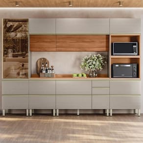 A Cozinha Modulada Proença 6 Peças com Cristaleira combina funcionalidade e design refinado. Produzida em MDF com pintura UV, conta com portas sendo 1 com vidro reflecta, dobradiças com amortecimento e pistão a gás. Suas gavetas possuem corrediças telescópicas para abertura suave, e os puxadores metálicos agregam durabilidade e elegância. O módulo torre quente oferece espaço para forno e micro-ondas (64 x 45 x 51 cm), enquanto o balcão de 120cm acompanha divisor de talheres. Os tampos em MDF estão presentes nos balcões de 120cm e 60cm. Com pés reguláveis e amplo espaço interno, é ideal para quem busca uma cozinha completa e sofisticada.