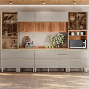 A Cozinha Modulada Proença 6 Peças com Paneleiro 1 Forno e Aéreo 120cm Ripado combina funcionalidade e design refinado. Produzida em MDF com pintura UV, conta com portas sendo 3 com vidro reflecta e 2 ripadas, dobradiças com amortecimento e pistão a gás. Suas gavetas possuem corrediças telescópicas para abertura suave, e os puxadores metálicos agregam durabilidade e elegância. O módulo paneleiro oferece espaço para forno ou micro-ondas (64 x 45 x 51 cm), enquanto o balcão de 120cm acompanha divisor de talheres. Os tampos em MDF estão presentes nos balcões de 120cm e 60cm. Com pés reguláveis e amplo espaço interno, é ideal para quem busca uma cozinha completa e sofisticada.