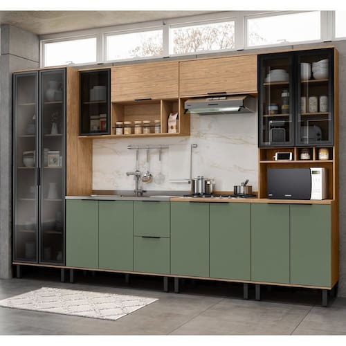 Itens Inclusos: 1 Cristaleira, 1 Aéreo 80cm, 1 balcão 80cm, 1 Aéreo 120cm, 1 Balcão 120cm, 1 Paneleiro 1 forno, manual e ferragens