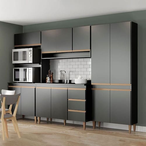 Caracteristicas: Marca: Menu Moveis Tipo de cozinha: Modulada Produzida em MDP de 15 mm Acabamento UV na cor Preto Texturizado Portas com Dobradica Metalica Gavetas com Corredica Telescopica Puxadores Perfil em ABS na cor Bronze Pes Regulares em ABS na cor Bronze