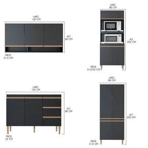 Modulos Inclusos na Cozinha: 0452: Paneleiro - Larg. 80cm Alt. 202cm Prof. 31,5cm P. 42kg 0449: Balcao Pia - Larg. 120cm Alt. 88cm Prof. 52cm P. 33,5kg 0451: Armario Aereo - Larg. 120cm Alt. 60cm Prof. 31,5 cm P. 24,5kg 0453: Armario Forno - Larg. 80cm Alt. 202cm Prof. 31,5/52cm P. 43kg