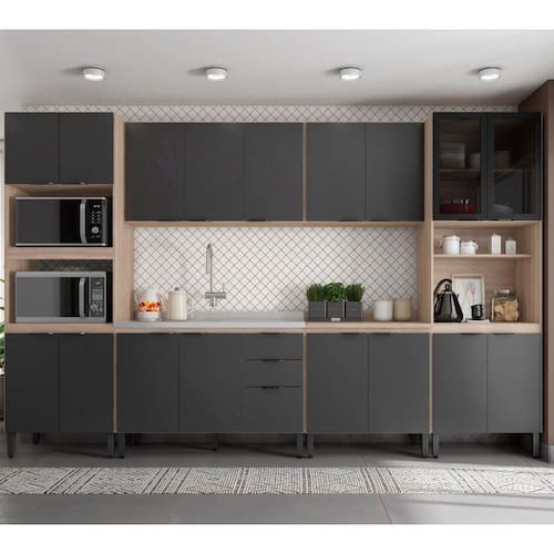 A Cozinha Modular Firenze proporciona a experiência de ter uma cozinha criada especialmente para a sua cozinha. São inúmeras opções de módulos para você criar a composição que melhor atender as necessidade da sua cozinha e visual sofisticado para valorizar ainda mais o ambiente. A sugestão de composição FMT006 é composta por paneleiro com espaços para instalar forno microondas e forno elétrico, armários aéreos com prateleiras internas de diferentes dimensões, paneleiro com portas de vidro fumê com espaço para outro forno ou se desejar, um linda decoração, balcão com diferentes espaços de armazenamento para instalar a pia de cozinha e também, balcão para instalar fogão cooktop ou para mais espaço de apoio e armazenamento. Incrível, não é mesmo? Viva essa experiência. Você vai amar.