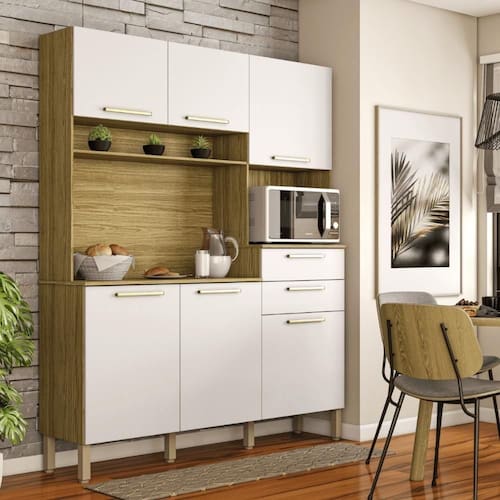 A Cozinha é produzida com madeira reconstituída - MDP de 12 mm e MDP de 15 mm nos tampos, provindo de reservas florestais para este fim, respeitando o meio ambiente. Possui seis portas, duas amplas gavetas - nas portas e gavetas são utilizados dobradiças e corrediças 100% metálicas. Os puxadores são em plástico resistente (poliestireno) com acabamento metalizado, que proporciona grande durabilidade. Seis pés reguláveis em plástico resistente (polipropileno) garantem a estabilidade do produto, podendo-se fazer pequenes ajustes na montagem, para o produto se adequar mesmo em pisos com pequenas irregularidades. Conta com nicho para pequenos objetos, além disso, tem nicho para micro-ondas e passa-fio no traseiro facilitando o acesso à tomada na parede. O espaço interno é bem dividido com a utilização de prateleiras, para melhor organizar os utensílios da cozinha. O acabamento é com pintura UV, deixando o móvel mais bonito com padrões de cor que trazem modernidade e beleza a sua cozinha.