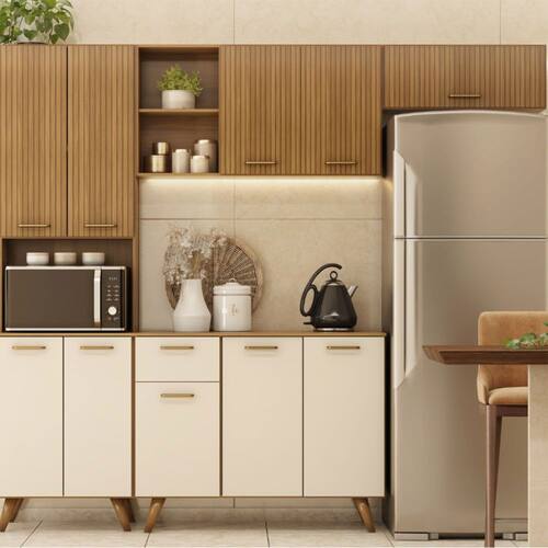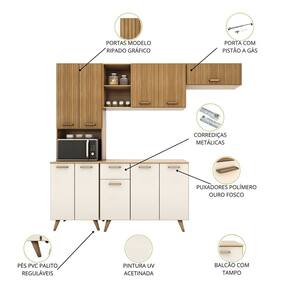 A Cozinha Compacta Olinda Poliman ? a escolha ideal para quem busca praticidade, funcionalidade e design sofisticado. Composta por um paneleiro duplo de 7 portas, um a?reo de 120 cm, um a?reo para geladeira e um balc?o de 105 cm com tampo, essa cozinha oferece amplo espa?o interno para organiza??o e otimiza??o do ambiente. O paneleiro conta com 4 portas de bater, prateleiras internas e um nicho para micro-ondas -A.40xL.55xP.43cm-, proporcionando praticidade no dia a dia. O a?reo de 120 cm possui 2 portas, prateleira interna e um nicho decorativo -A.26xL.34xP.24cm-, agregando charme e sofistica??o ao espa?o. J? o a?reo para geladeira conta com porta basculante com pist?o a g?s, garantindo abertura suave e mantendo a porta suspensa, sendo ideal para ser utilizado sobre a geladeira ou fog?o. O balc?o de 105 cm possui 3 portas de bater, prateleira interna e 1 gaveta com corredi?as met?licas, al?m de um tampo em MDP de 12mm para maior resist?ncia e durabilidade. Toda a estrutura da cozinha ? fabricada em MDP com pintura UV acetinada, garantindo qualidade e acabamento impec?vel. As dobradi?as refor?adas de 26mm, os puxadores em pol?mero ouro fosco e os p?s modelo palito em PVC regul?veis ao piso de 18cm asseguram estabilidade, nivelamento perfeito e um toque sofisticado ao ambiente. Al?m de sua beleza e funcionalidade, a Cozinha Compacta Olinda Poliman ? um produto ecologicamente correto, com embalagem projetada para evitar avarias e garantir que chegue em perfeito estado ? sua casa. Combinando perfeitamente com diversos estilos de decora??o, essa cozinha reflete a qualidade e excel?ncia que s? a Poliman oferece em seus produtos.