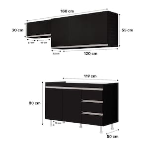 Cada peça é construída em 100% MDF e possui um acabamento em BP que garante durabilidade e resistência. Este conjunto inclui um impressionante Balcão Gabinete de 120cm, completo com 03 gavetas equipadas com corrediças telescópicas para um deslize suave e silencioso. Além disso, o armário da geladeira possui pistão a gás, proporcionando abertura e fechamento suaves e sem esforço.
