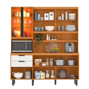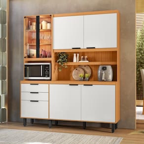 O grande diferencial da Cozinha Murano são suas duas portas com vidro transparente e iluminação LED embutida, que criam um ponto de destaque luxuoso no ambiente. Além da estética premium, o kit oferece praticidade real com um nicho exclusivo para micro-ondas e gavetas com corrediças telescópicas, que garantem abertura total e suave. É o móvel ideal para manter utensílios, eletrodomésticos e mantimentos sempre em ordem com durabilidade superior.