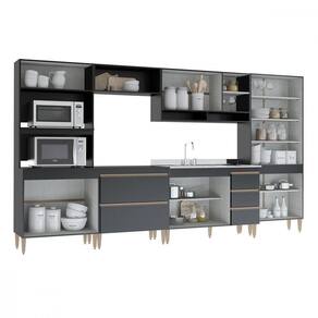 Cozinha Sabrina 360x202 6p Pia/paneleiro Preto Menu Móveis Preto A Cozinha Modulada Sabrina foi desenvolvida para atender todas as suas necessidades do dia a dia com um design moderno, cheio de atitude, personalidade, funcionalidade, beleza e versatilidade. A Cozinha preta e a tendencia do momento e foi arquitetada com modulos uteis que vao facilitar a sua rotina diaria nos preparos dos alimentos e armazenamento dos utensilios e mantimentos, mantendo sua cozinha sempre organizada. Por se tratar de armarios de cozinha modulados voce pode ajustar os modulos conforme o espaco disponivel e montar diversas modulacoes diferentes para deixar o ambiente muito mais aconchegante. A elegancia fica por conta dos puxadores em perfil e os pes na cor bronze dando um toque unico de sofisticacao. A Cozinha Sabrina e produzida com materiais de excelente qualidade, garantindo a durabilidade e vida util. O melhor em moveis no design atual aliando conforto, qualidade e otimos precos, so na Menu Moveis! Caracteristicas: Produzida em MDP de 15 mm Acabamento UV na cor Preto Texturizado Portas com Dobradica Metalica Porta Basculante com Pistao a Gas Gavetas com Corredica Telescopica Puxadores Perfil PVC na cor Bronze Pes Regulares ABS na cor Bronze Balcao para Cooktop possui Tampo com Ranhura que pode ser utilizado com Cooktop de 5 bocas, caso nao cortar pode utilizar normalmente NAO acompanha TAMPO e PIA