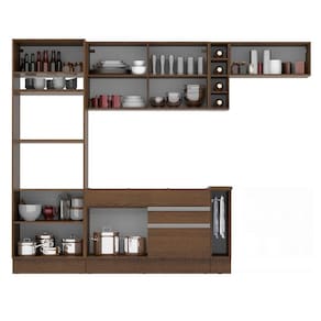 - Itens inclusos: Uma (1) torre quente com dois (2) nichos para forno e micro-ondas, um (1) nicho menor e três (3) portas sendo uma (1) basculante | Um (1) balcão de pia com duas (2) gavetas e uma (1) porta (não acompanha tampo) | Um (1) balcão porta panos com tampo Rustic | Um (1) aéreo com duas (2) portas | Uma (1) mini adega | Um (1) aéreo com uma (1) porta basculante