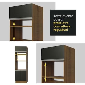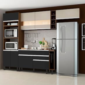 - Itens inclusos: 1 torre quente com dois nichos para forno e micro-ondas | 1 nicho menor e três portas sendo uma basculante | 1 balcão de pia com duas gavetas e uma porta, não acompanha tampo | 1 balcão porta panos com tampo Mood | 1 armário aéreo com duas portas com detalhe em vidro reflex | 1 mini adega | 1 armário aéreo com uma porta basculante