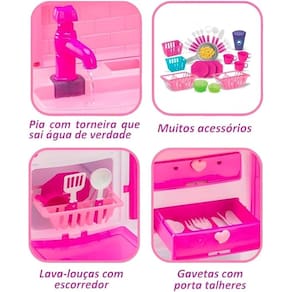 Recomendado à partir de 03 anos Acionamento da torneira: Bomba d´água Gaveta, geladeira e microondas e forninho com porta abre e fecha Pia com torneira que sai água de verdade Gavetas com porta talheres Lava-louças com escorredor Galedeira com prateleiras Nichos para cestinhas