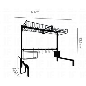 Acompanha todos os acessórios: - 04 Ganchos em "S" 4cm x 7cm (zincados) - 01 Quadro em Aço - 02 Extensores de altura (8,5cm) - 02 Pés de sustentação - 01 Porta detergente 18cm x 13cm - 01 Cesto suspenso 31cm x 8cm x 21,5cm - 01 Porta talheres 11cm x 13cm - 01 Porta Pratos 28,5cm x 24,2cm - 01 Porta tábua 16,5cm x 14cm