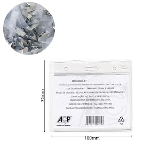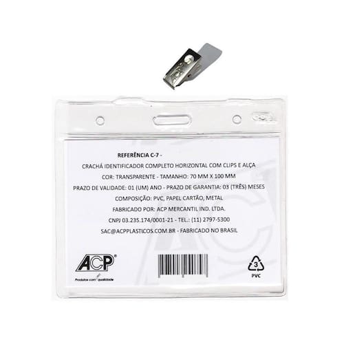 Crachá Identificador Acp Presilha Jacaré 70x100mm C-7 C/100 O Porta Crachá ACP serve para identificação de um objeto ou para identificação pessoal, seja para funcionários, prestador de serviços ou até mesmo visitantes, também pode ser utilizado para proteger bilhete único de transporte, cartões, carteirinhas e entre outros. - Marca: ACP- Referência: C-7- Cor: Cristal- 100 unidades crachá- 100 unidades Presilha Jacaré - Transparente - Crachá Horizontal- Abertura Vertical- Tamanho: 70 mm x 100 mm- Composição: PVC e Metal