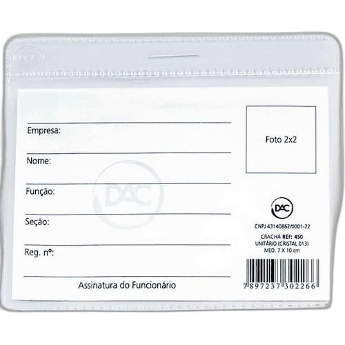 categoria: papelaria e escritorio nome: cracha sem presilha descrição: transparente 7x10 cm. 0,13 marca: dac modelo: 1045 ean: 7897237310452 embalagem: pacote com 50 dimensões da embalagem: - altura: 2,5 cm - largura: 9 cm - comprimento: 12 cm - peso: 0,2 kg Marca: Não Informado