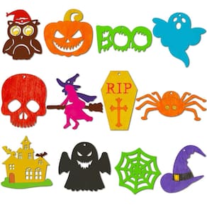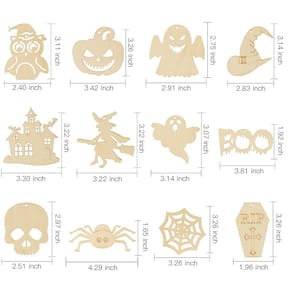 - O pacote inclui: 60 peças de enfeites de madeira de Halloween com 12 formas (fantasma 8* 7,8 cm/7* 7,4 cm, bruxa 8,2* 8,2 cm, teia de aranha 8,3* 8,3 cm, abóbora 8,7* 8,3 cm, boo 9,7* 4,9 cm, aranha 10,9* 4,2 cm, chapéu de bruxa 8* 7,2 cm, caveira 7,5* 6,4 cm, caixão 8,3* 5 cm, Coruja (7,9* 6,1 cm, Castle 8,2* 8,4 cm), 60 fios de juta, 10 marcadores coloridos, suficientes para qualquer projeto de artesanato que você esteja realizando, ótimos para pendurar no Halloween.