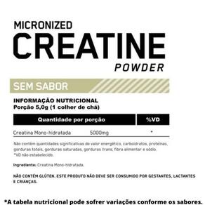 Benefícios da Creatina Powder Optimum Nutrition Aumento da energia Melhora da força física Maior volume muscular Aumento da performance Aumento da hipertrofia muscular Rápida absorção Sem sabor Sem cheiro Sugestão de uso da Creatina Powder Optimum Nutrition