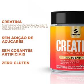 Produto: Creatina Dado de Caramelo Marca: SUPERNUTRITION Quantidade: 40 unidades Ingredientes: Água, leite integral em pó e/ou leite integral, creatina monohidratada, edulcorantes sorbitol, isomalte, sucralose , espessantes polidextrose, gelatina , estabilizantes pectina cítrica, citrato de sódio , regulador de acidez bicarbonato de sódio , aromatizante aroma idêntico ao natural de caramelo , conservante sorbato de potássio . Alérgenos: Contém leite e derivados, contém lactose. Não contém: Glúten Modo de Conservação: Manter em local seco e fresco, longe da umidade e da luz direta.