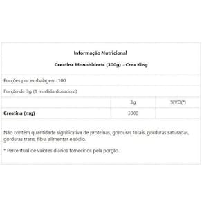 Creatina Monohidratada 300g - Padrão: Único Creatina Monohidratada 300g - Crea King A creatina é a chave para força, resistência e recuperação aprimoradas, sendo um suplemento popular entre atletas e entusiastas do fitness, e por boas razões. Este composto natural, encontrado no corpo e em alimentos como carne vermelha e peixe, oferece uma série de benefícios significativos para o desempenho esportivo e a saúde em geral, tais como: Benefícios: Aumento da força e potência muscular; Ganho de massa muscular; Melhora a performance dos treinos; Melhoria do desempenho de alta intensidade Recuperação mais rápida; Revigora as fontes de energia; Melhoria cognitiva; Evita fadiga muscular. A Crea King é uma marca focada em Creatinas, sendo que todos os seus produtos possuem Creatina na composição. Nossa missão é ajudá-lo a conquistar seus objetivos proporcionando mais força e desempenho através da ingestão de Creatina. Marca: Não Informado