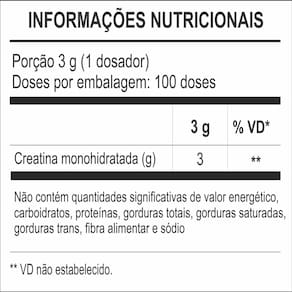 Ingredientes:Creatina mono hidratada. Conservar em local fresco e seco, ao abrigo da luz inclusive após aberto. ALÉRGICOS: PODE CONTER DERIVADOS DE LEITE SOJA E OVO.