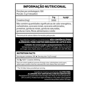 sugestão de uso diluir 3 dosadores 3g em 150ml de água 30 minutos antes dos treinos ou conforme orientação profissional. Ingredientes creatina monohidratada. Não contém glúten. Recomendação este produto não é um , produto indicado para maiores de 19 anos, não exceder a recomendação diária de consumo indicada na embalagem, mantenha fora do alcance de crianças, este produto não deve ser consumido por gestantes, lactantes e crianças. Manter em temperatura ambiente 15c a 30c . Proteger da luz e manter em lugar seco. Conservação mantenha fora do alcance de crianças. Manter em lugar fresco, não úmido e ao abrigo de luz. Não consumir o produto se o lacre de proteção estiver violado. Alérgicos pode conter derivados de leite.