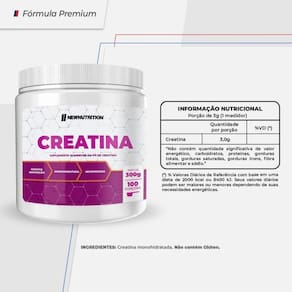 A Creatina 300G Micronizada Monohidratada New Nutrition é um suplemento de alta qualidade e com bons efeitos para a saúde. A creatina é um aminoácido produzido pelo próprio organismo do ser humano a partir de um composto de aminoácidos presentes nas fibras musculares. Cerca de 95% da creatina são estocados na forma de fosfocreatina nos músculos, enquanto os outros 5% são estocados no cérebro e outros órgãos.