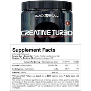 A creatine turbo 300g da linha caveira preta series da black skull usa é um suplemento a base de creatina monohidratada e maltodextrina. Onde é comprovado que, a utilização de carboidratos em conjunto com a creatina, promove maior eficácia no efeito da creatina, além do carboidrato agir no aumento de energia, visando apoiar seus resultados nas atividades físicas, oferecendo maior energia e consecutivamente, melhor desempenho. Sendo recomendado o consumo de 6g 1 colher de chá ao dia. Ingredientes creatina monohidratada e maltodextrina. Não contem glúten. Como consumir adicionar 1 colher de chá 6g do creatine turbo em 150ml de água e consumir uma vez ao dia ou conforme recomendação do fabricante.