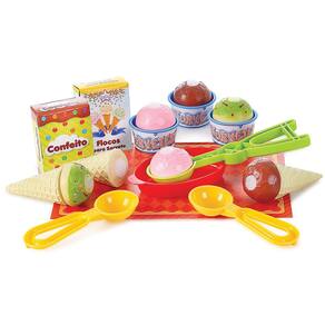 2 toalhas cartonadas, 2 caixinhas cartonadas, 6 bolas de sorvetes, 3 copinhos, 1 pá de sorvete, 3 casquinhas, 2 colheres e 1 travessa