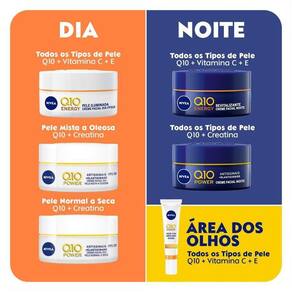 NovoNivea Q10 Plus C Antissinais combina dois poderosos antioxidantes, coenzima Q10 e Vitamina C pura. Sua fórmula não oleosa de rápida absorção e ajuda na oxigenação das células e proporciona uma pele revigorada.