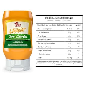Os creme cheddar são produtos únicos e totalmente inovadores no mercado, para do queijo comum e , eles possuem todo o sabor do queijo, com zero calorias, zero gorduras e com um teor de sódio abaixo de um queijo comum. Creme cheddar Ingredientes: água, polidextrose, queijo cheddar, amido de batata modificado, sal rosa do himalaia, fibra de milho, lactase, espessante goma guar, acidulante ácido lático, conservadores sorbato de potássio e benzoato de sódio, aromatizante e edulcorante natural stevia. Queijo cheddar fornece quantidades não significativas de gorduras . Não contém glúten. Não contém lactose. Marca: Não Informado Ean: 27896573360507