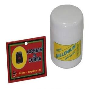Creme da Cobra Ofereça um teste desse produto de beleza , ou deixe em algum local de cosméticos e aguarde. Quando a alguém for abrir desavisado, levará um susto daqueles com uma cobra de pano saltando de dentro do recipiente para cima da pessoa. Todos certamente vão cair no riso. Diversão e susto Garantidos. Itens Incls: 01 Pote com uma cobrinha de pano