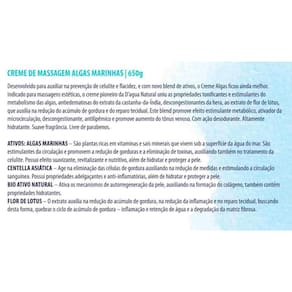 Desenvolvido para auxiliar na prevenção de celulite e flacidez, e com novo blend de ativos, o Creme Algas ficou ainda melhor. Indicado para massagens estéticas, o creme pioneiro da D’agua Natural uniu as propriedades tonificantes do metabolismo das algas, antiedematosas do extrato da castanha-da-Índia, descongestionantes da hera, ao extrato de flor de lótus, que auxilia na redução do acúmulo de gordura e do reparo tecidual. Este blend promove efeito metabólico, ativador da microcirculação, descongestionante, antilipêmico e promove aumento do tônus venoso. Com ação desodorante. Altamente hidratante. Suave fragrância. Livre de parabenos. Produto testado dermatoloficamente.