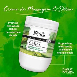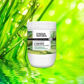 Desenvolvido com exclusivo blend de suco verde e água de coco desidratada, o creme C-DETOX Dagua Natural, possui ação drenante e desintoxicante, além de reforçar o sistema antioxidante da pele. A combinação dos extratos de abacaxi, couve, gengibre e pepino promovem a renovação celular na superfície da pele além de promover a ativação da circulação, devido à sua ação termogênica. A água de coco estimula a eficiência energética das células, atuando por mecanismo Detox mitocondrial proporcionando mais saúde, vitalidade e energia à pele. Deslizamento ideal para massagem. Altamente emoliente. Livre de parabenos.