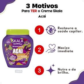 Para a felicidade dos Skalovers, a Dona Skala apresenta mais novidades para a linha Frutástica! Mergulhe na cremosidade brasileira do Açaí para nutrir seus fios. O Creme De Tratamento Skala Frutastica Açai 1000g é a união do melhor das vitaminas e da ciência capilar, oferecendo um mix de frutas recheado de frescor, vitalidade e nutrientes essenciais para seus cabelos. Sua fórmula, enriquecida com Guaraná, Melaço de Cana e Manteiga de Tucumã, proporciona cuidado e brilho intenso com um aroma irresistível, ideal para quem busca revitalizar cabelos secos e sem brilho.