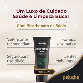 O creme dental da peluche cosméticos pet a base de menta foi desenvolvido para promover a higienização bucal do seu pet, evitando o mau hálito e prevenindo a formação de placas bacterianas, tártaros, gengivite, amarelamento, entre outras doenças bucais. Sua fórmula não contém flúor ou sabão que sejam nocivos aos pets, podendo assim ser ingerido sem perigo.