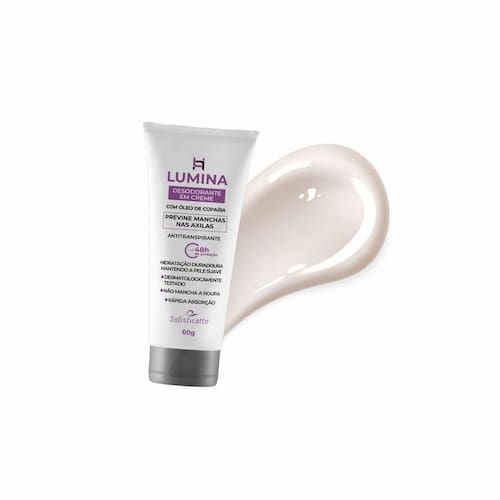 Creme Desodorante Antimancha Roupas E Axilas 48h De Proteção Desodorante Antimanchas Proteção e Cuidado para Sua Pele Você está cansado de manchas nas axilas causadas pelo desodorante Experimente agora o Desodorante em Creme Antimanchas Lumina, desenvolvido para proteger sua pele e suas roupas O Desodorante Antimanchas Antitranspirante Lumina que proporciona proteção por até 48 horas, atua como um tratamento para evitar manchas nas axilas. Lumina Desodorante é formulado com Óleo de Copaíba proveniente da floresta amazônica que é um ativo natural poderoso com diversos benefícios para a saúde e bem-estar. Esse ativo tem uma grande capacidade antimicrobiana que pode ajudar contra as bactérias responsáveis pelo mau odor corporal. Oferecendo uma proteção eficaz sem comprometer suas roupas favoritas. O Desodorante Antitranspirante Lumina redefine a experiência de cuidados pessoais, oferecendo uma solução completa para o seu dia a dia. DERMATOLOGICAMENTE TESTADO Benefícios do Desodorante Antimanchas: Antitranspirante Proteção 48 horas Contra manchas nas axilas Combate manchas em roupas Rápida absorção Fórmula testada dermatologicamente ATENÇÃO O Desodorante Lumina ajuda a evitar manchas nas axilas e NÂO possui ação clareadora. Caso você já tenha manchas nas axilas, precisa utilizá-lo em conjunto com o Clareador Corporal com Rosa Mosqueta Lumina ou algum de sua preferência. ANVISA PROCESSO: 25351.227969/2024-52 Modo de usar: Aplique uma leve camada do Desodorante Lumina diretamente nas axilas em movimentos circulares. Aguarde o produto secar antes de colocar a roupa. Dúvidas Frequentes: 1.Posso utilizar esse produto diariamente Sim. O Desodorante Lumina é um produto pensado para ser diariamente, protegendo suas axilas contra manchas e mau odor por 48 horas, sem manchar a roupa. 2.Qual a diferença do Desodorante Lumina para o Creme Clareador Lumina Agora o tratamento está completo. O Desodorante Lumina tem como função proteger as axilas, sendo antibacteriano, com até 48 horas de proteção contra o mau odor, rápida absorção e sem manchar a roupa. Além disso, graças à sua composição, previne manchas nas axilas com o uso diário. Já o Creme Clareador é voltado para quem já tem manchas escuras, agindo para clarear e uniformizar a pele das axilas, sem agredir. Pode também ser em outras partes escurecidas do corpo, como virilhas, coxas, joelhos e cotovelos -------------------------------------- Tags de Pesquisa: Desodorante antimanchas, manchas nas axilas, proteção contra manchas, desodorante que não mancha roupas, evitar manchas nas roupas, melhor desodorante anti manchas, desodorante para desmanchar axilas, axila escura, axilas escuras o que fazer, axila escura o que pode ser, mancha escura axila